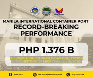 The Bureau of Customs – Manila International Container Port (BOC-MICP) has set its own record books, logging the highest single-day collection in its history — a jaw-dropping ₱1.376 BILLION in just one day on February 18, 2026.