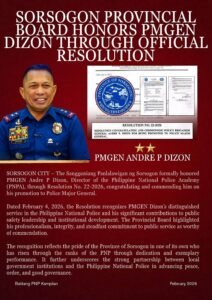 The Sangguniang Panlalawigan ng Sorsogon fired off Resolution No. 22-2026 to honor one of its own — PMGEN ANDRE P. DIZON, now officially a Police Major General and Director of the Philippine National Police Academy (PNPA).